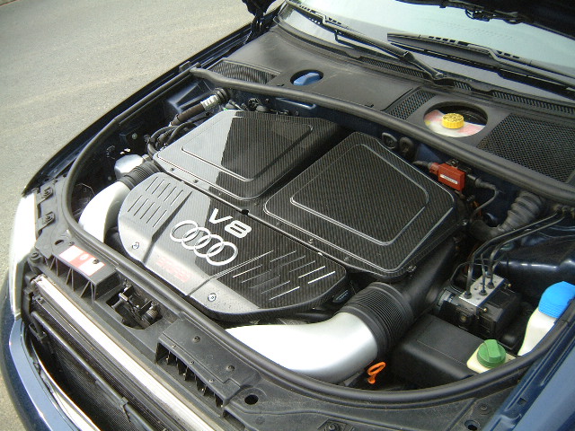 What the Lamborghini Murciélago is to adolescent boys and those seeking the essence of exoticar sex appeal, the Audi RS6 is to bankers, lawyers and those seeking the quintessential stealth appeal of a world beater Q-ship. Prior to Audi's purchase of Automobili Lamborghini SpA, seldom did one make mention of the two marques in the same sentence. While the RS6's 450 bhp, twin turbo, 4.2 liter, V8 mill falls short of the bad boy Lambo's motor, it certainly holds it's own against a bevy of other sports cars. A quick scan of a recent Road & Track Road Test Summary and one discovers that the RS6 motor bests a large number of other manufacturers' sporting models: Aston Martin DB7 Vantage, Bentley Arnage Red Label, BMW's M5 and Z8, Corvette Z06, Ferrari 360 and 456, Jaguar's R models, Lotus Esprit V8, Mercedes-Benz's C32 AMG, CLK55 AMG, E55, SLK32 AMG, S55 AMG, and Porsche's base model 911 Turbo. Conversely, only a handful of U.S. street legal super cars outdo the RS6 from an absolute horsepower output standpoint: Dodge Viper GTS-R, Ferrari 575M, the aforementioned Lamborghini, Porsche 911 GT2 turbo, and the Ruf R Turbo. This is not to imply that the RS6 outperforms these other cars in the classical sense, just a data point in the ever escalating horsepower wars.